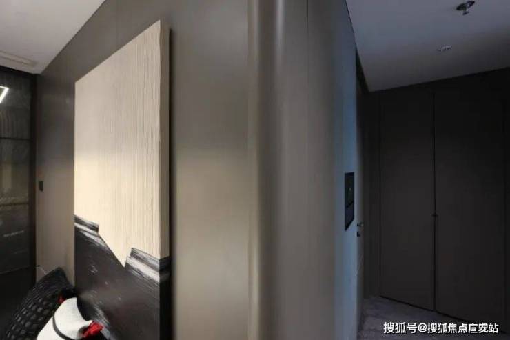主卧入户隐形门设计/客厅一体式背景墙/橱柜收口 弧形木饰面 处理;