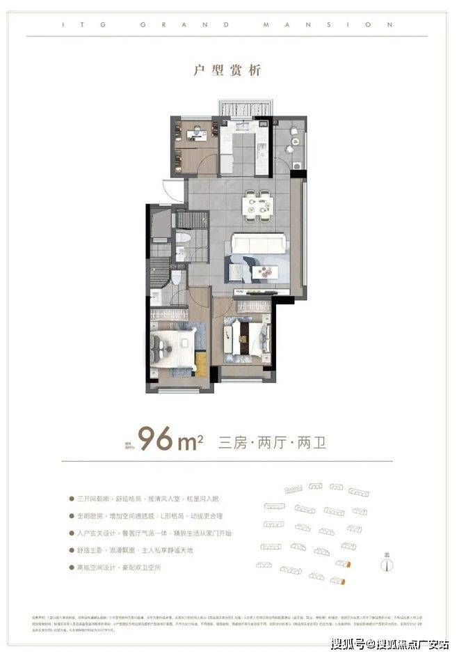 户型解析:约96㎡的3房,这种进阶级的产品当然最能体现舒适感。比如在入户动线上,客餐厅LDK设计更能凸显与家人的亲密交融。同样也利用客厅阳台,次卧阳台,主卧飘窗,北向书房飘窗这些更多的开窗面,向阳而生。