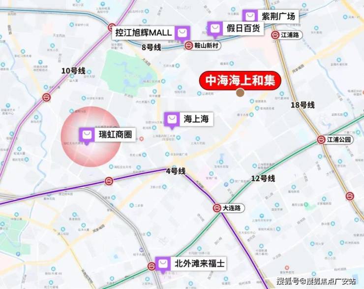 另外商业方面:北侧约500米就是控江路商圈,有控江旭辉MALL、紫荆广场等成熟商业。西侧约1.5公里处就是瑞虹天地,去往北外滩来福士也非常便捷。