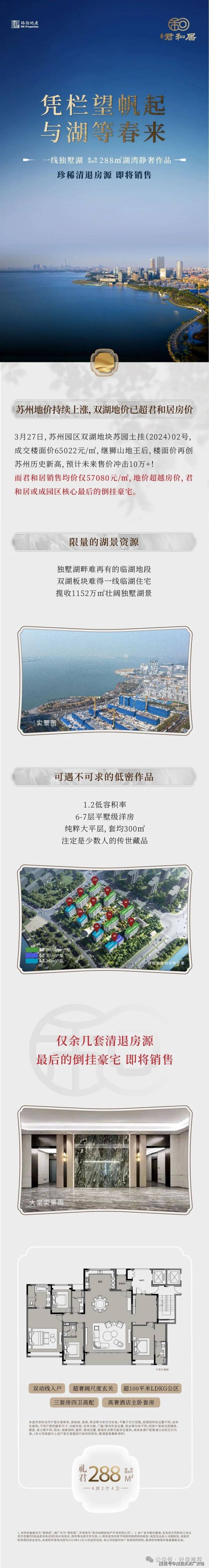 2、产品新,精装交付,而且标准不低,这给业主省了很多事;3、高总价、大面积筛选出苏州顶尖的圈层,仅123套,认知一致,后期问题会大量减少;