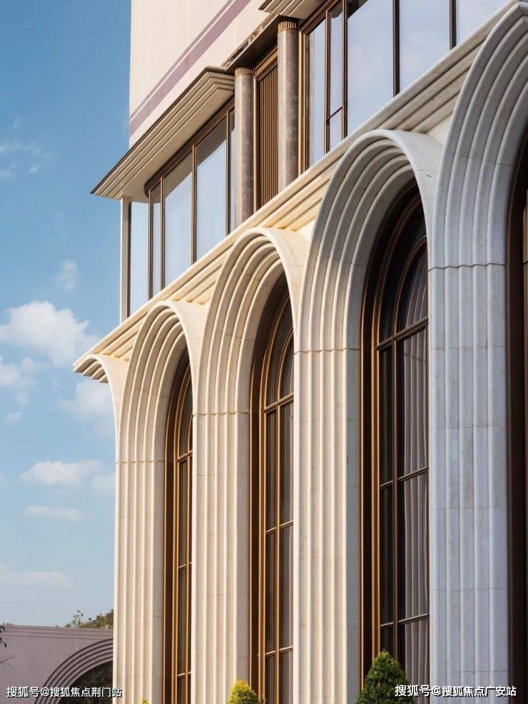 每一层挑檐都用仿石铝板叠加出9层折面,建筑四角以仿石铝板罗马立柱支撑,每根都雕出三段式结构,精致得像是一件艺术品.