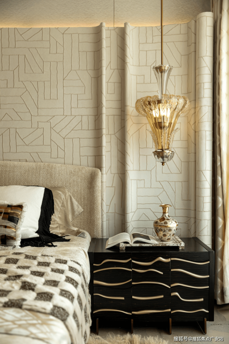 私密场域依旧保持静谧,黑白色基础上搭配了更多的色彩,例如深棕、浅紫等,艺术品的衬托深邃迷人,热络了家的氛围。