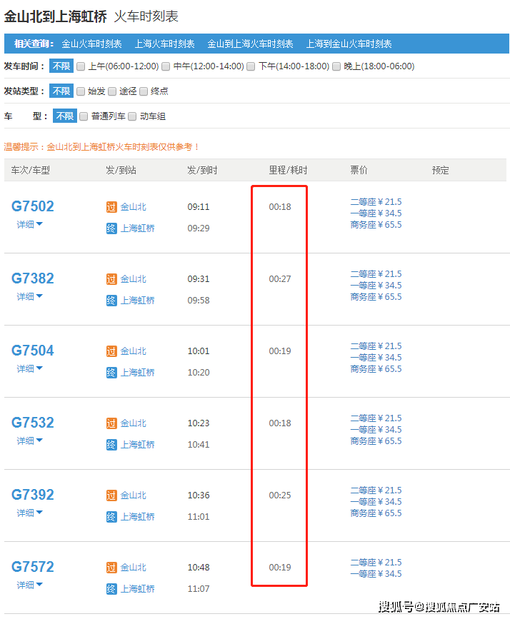查询火车时刻表可以看到,金山北站到大虹桥核心枢纽只有1站,通勤时间远远低于十几站且站站停的地铁。