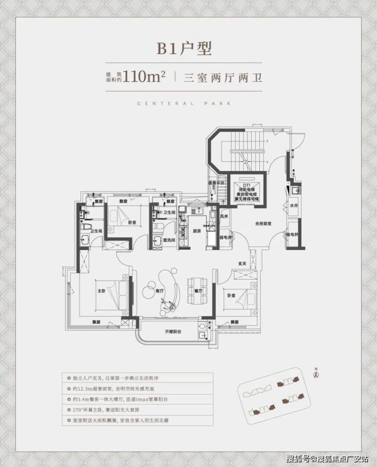 先来看建面约110㎡边套大横厅户型:约12.3米的超宽绰面宽几乎是堪比别墅产品了,这个视野和南向采光面相当出众。