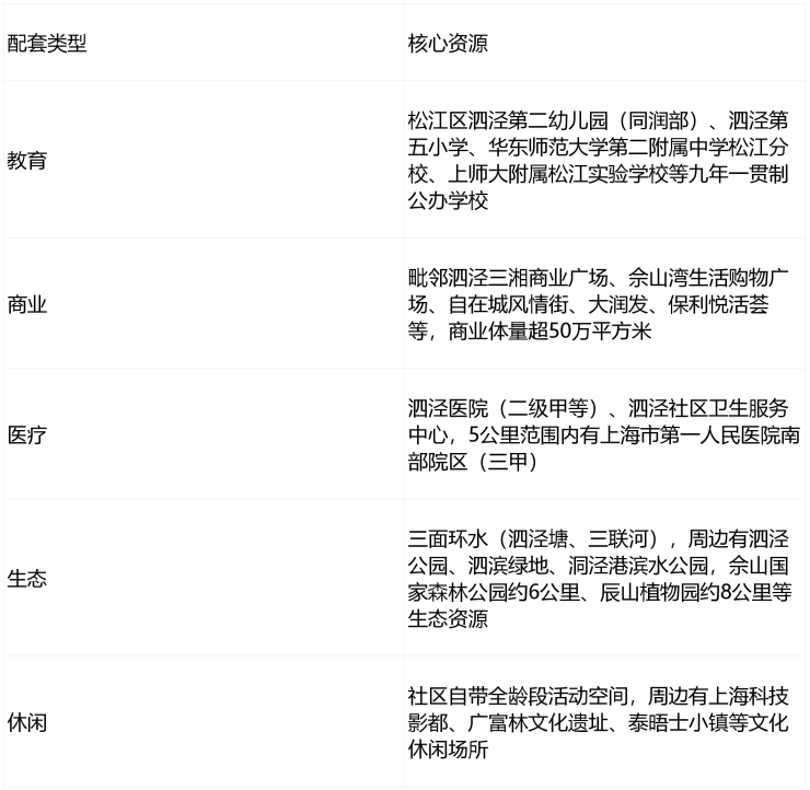国际教育集群:周边拥有宋庆龄国际学校、协和双语学校、松江西外、包玉刚学校等国际名校,以及泗泾第二幼儿园(同润部)、泗泾第三小学、松江四中初级中学等公立学校,形成从幼儿园到高中的完整教育链条,满足全龄段教育需求