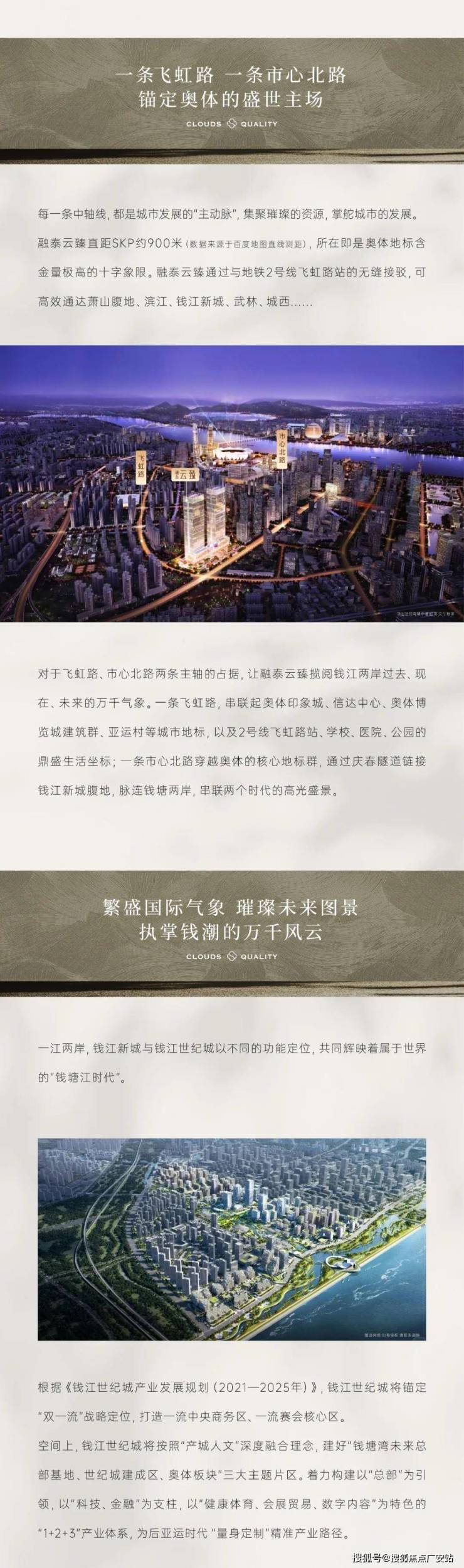 Rongtai Yunzhen is a high-end residential project in the Olympic Sports Center area of Qianjiang Century City, Hangzhou, developed by Hangzhou Litai Real Estate Co., LTD. It is positioned as a TOD large flat luxury residence. The following is a summary of the core information