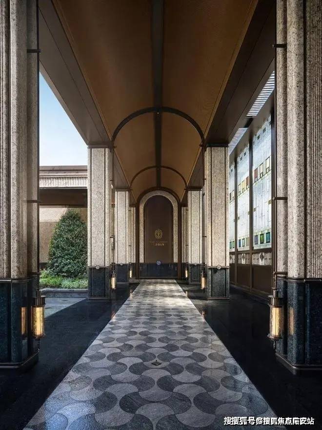 走在约30米的艺术连廊,第一时间想到的就是繁花电视剧里出现过的和平饭店拱形廊道。但建发·海阅首府取其精髓,融合现代工艺重新演绎,更具时尚感。