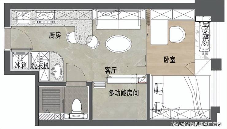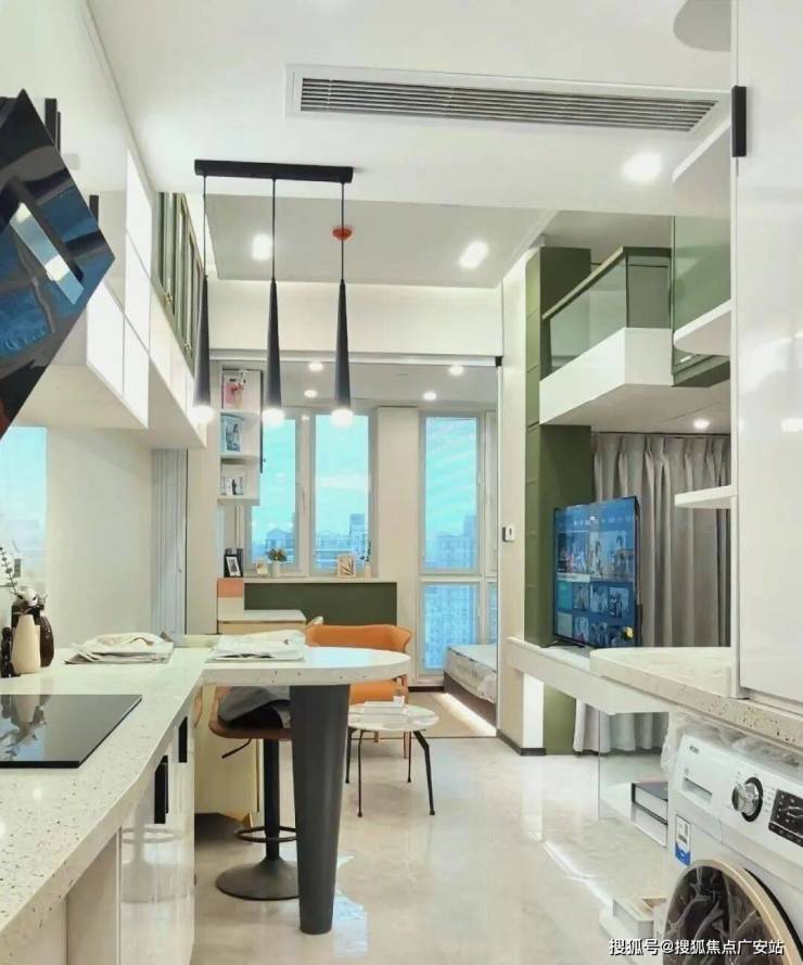 Living room「客厅」+Dining room「餐厅」+Kitchen「厨房」+Toilet「卫浴」,LDKT一体化设计。