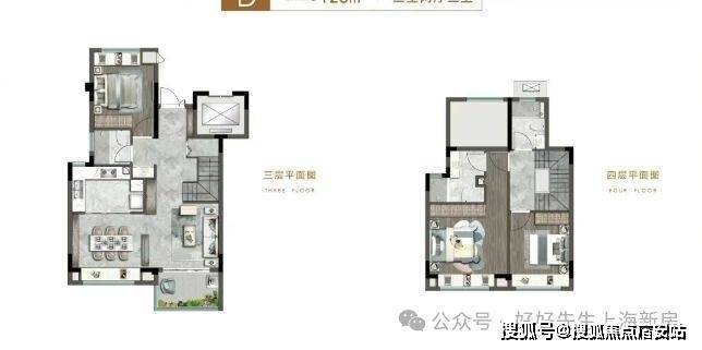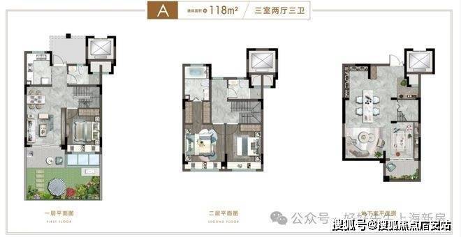 约123平上叠3房户型,共上下两层,全明设计,格局开阔,宽景阳台,上承天空,下承生活。