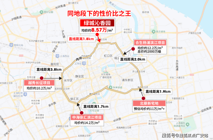 其次,项目距离预计约18万+的瑞虹地王直线约3.9km、距离北外滩直线约4.9km,几乎就是一脚油门就能抵达的存在。
