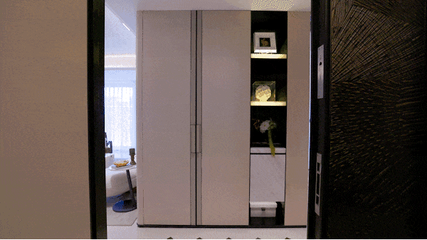 收纳柜可容纳全家四季鞋履、行李箱、婴儿车、滑板等!彻底解决玄关杂乱痛点,同时化身快递拆包区、宠物清洁站,约8-10㎡灵活空间甚至可改造为消毒区、临时会客区,实现“一厅多用”!