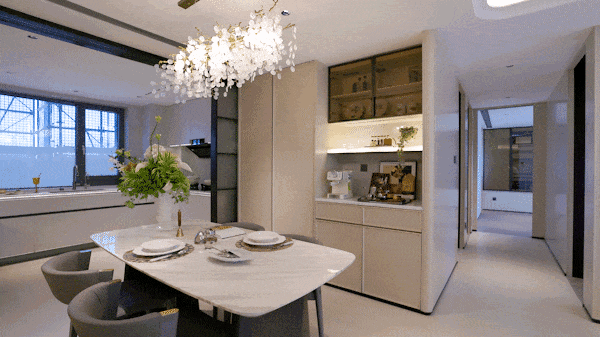 延伸出的"早C晚A"魔法空间,藏着都市人的生活仪式感:清晨,胶囊咖啡机吐出第一缕醇香,骨瓷杯沿的奶沫画出心形拉花;入夜,威士忌酒柜的柔光亮起,水晶杯折射出琥珀色的微醺时刻!