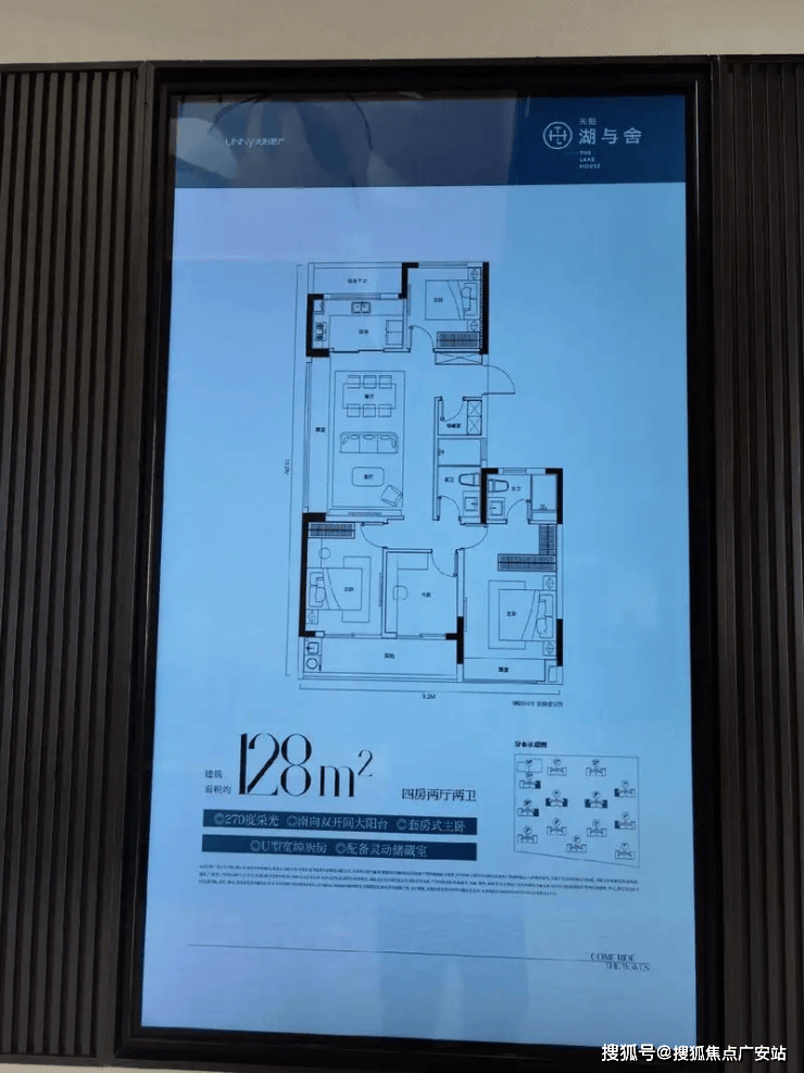 128㎡:四房两厅,空间阔绰,适合三代同堂,270°转角观景阳台,引湖景入室。