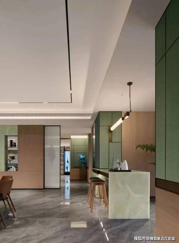 潮博商业中心售楼处电话☎:400-865-7114✔✔为匹配这片空间的奢阔,琚宾选用臻稀青玉作为背景墙安置于客厅中轴之上,将玉石与当下的生活方式相融,进而打造出蕴藏东方空间美学的私域。