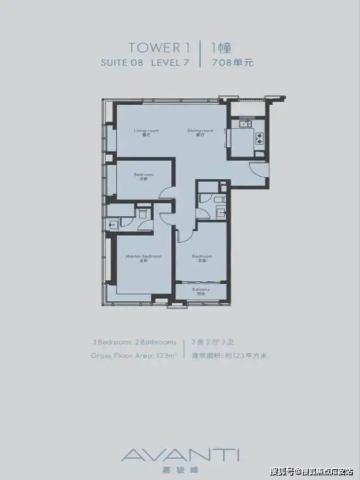 嘉骏峰建面约123㎡户型设计,以科学合理的分区规划, 打造3室2厅2卫的品质空间。