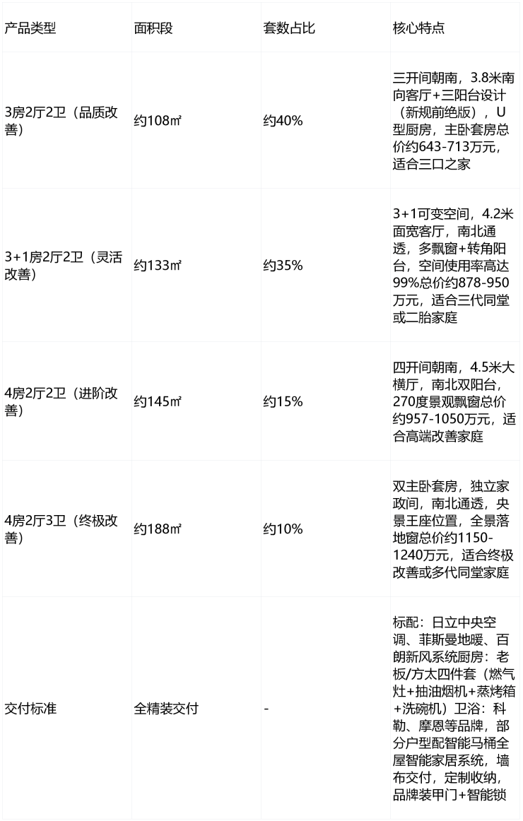 主力户型:建面约108-188㎡3-4房,得房率约78-90%(部分户型空间使用率高达99%),全精装交付(中央空调+地暖+新风系统三大件),精装标准约4000-4500元/㎡