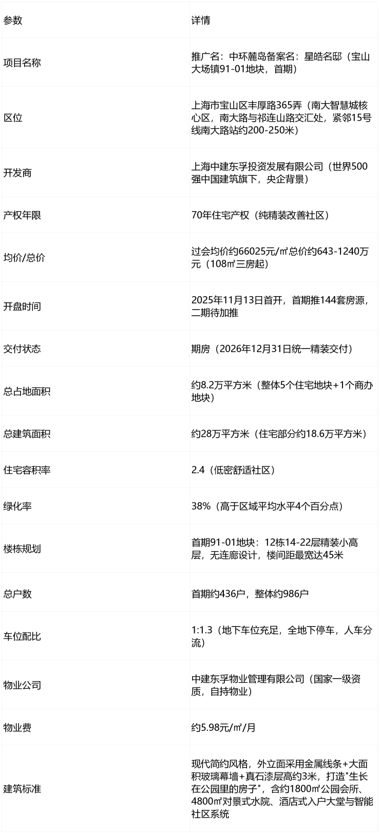 核心定位:中建东孚(中国建筑旗下)打造的上海首座PARK-TOD综合体,宝山南大智慧城公园环绕型改善标杆,12栋14-22层精装小高层,主打约108-188㎡3-4房,过会均价约66025元/㎡,总价约643-1240万元,适配品质改善至终极改善家庭,2026年12月31日精装交付