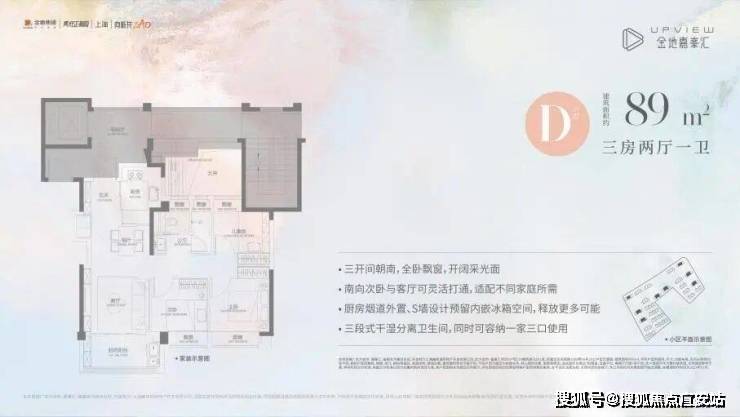 最后是D户型,不到90㎡直接3房一步到位,降低了刚需客户的上车门槛;三开间朝南+LDK一体化设计,采光性能优异,视野开阔;全卧飘窗,干湿分离卫生间,烟道外置,S墙内嵌设计,更大程度的增强空间利用率。