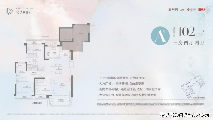 A户型是建面约102㎡3房2厅2卫,该户型三开间朝南,采光效果上佳。大方厅设计,空间开阔自由度更高。南向次卧和客厅可灵活打通,适配不同家庭所需;大进深阳台+全景落地窗,让室内的通透性和视野可圈可点。