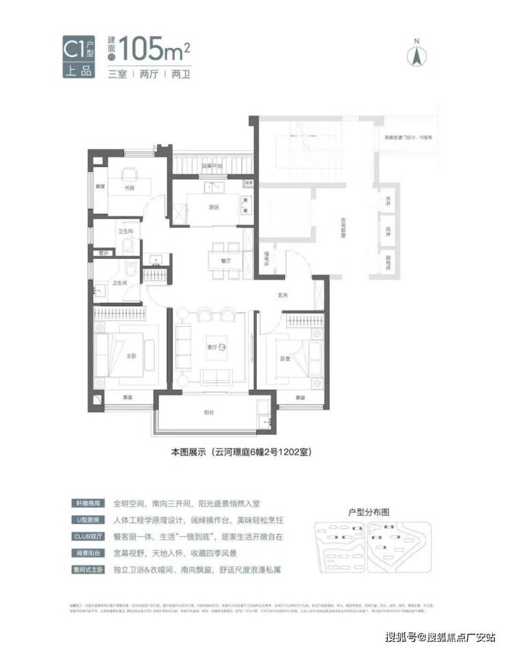 建面约105㎡3房2卫有宽厅和竖厅两种风格,其中宽厅户型好评度颇高。