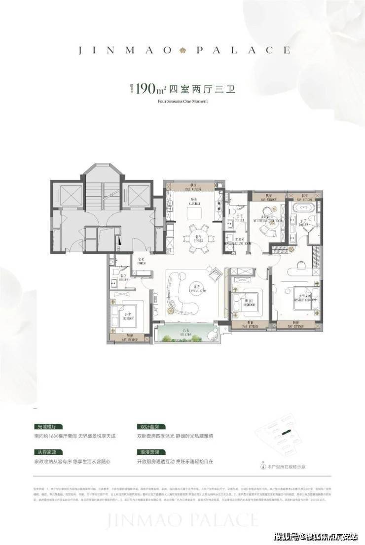 ●建面约190㎡4房:楼王位置的顶奢大平层,同价位段在杨浦只能买到约120㎡3房!
