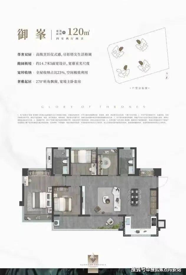 设计的是横厅南北通透格局,客餐厅开间8米,约14.7米超幕视野,超长阳台,主卧转角270°大飘窗,U型厨房,得房率:78.99%(不含赠送),阳台主朝西南或东南向。