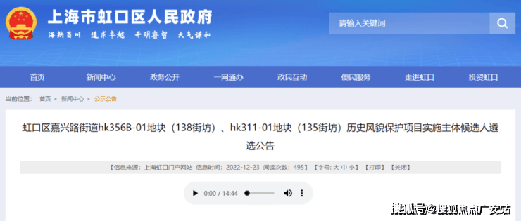 2022年12月23日虹口区人民政府网发布了关于嘉兴路街道hk356B-01地块(138街坊)、hk311-01地块(135街坊)历史风貌保护项目实施主体候选人遴选公告。