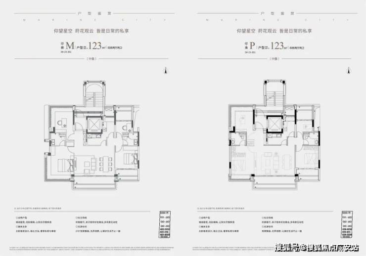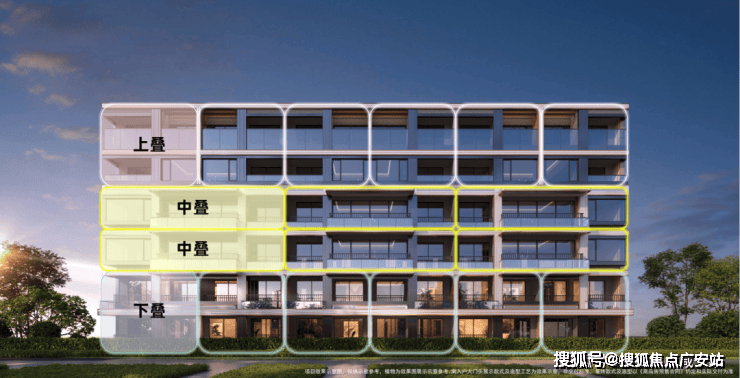 而中叠(建面约123㎡)则集便利与尺度于一身:不仅配备独立电梯厅,更以约13.4米南向面宽、约6米宽厅及南北双270°转角飘窗,营造出宽幕视野与通透空间,体感媲美整层大平层,实得率几近“满格”。