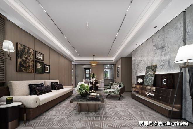 双大堂系统则将尊崇感贯穿于归家动线的每一程。社区主入口大堂以酒店式的空间尺度与艺术化陈设,完成从城市到社区的过渡;单元入户大堂则进一步将仪式感升华,精选雪山飞狐、高山流水等珍稀奢石作为主背景,天然形成的山水纹理宛如艺术画卷。搭配精心设计的艺术吊灯与金属细节,营造出兼具归家温馨感与艺术馆般精致度的“第二客厅”。从公共到私属,双重大堂不仅实现了功能分区,更通过材质与光影的层层递进,完成了情绪上的铺垫与升华。