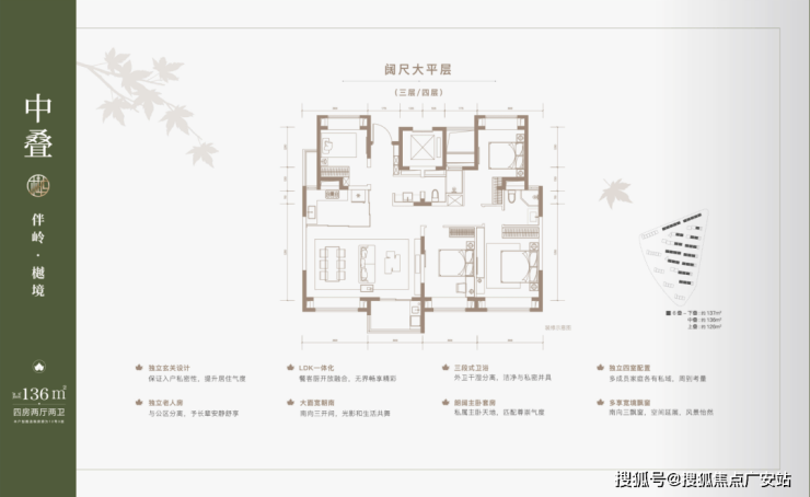 建面约137㎡下叠,四房两厅三卫全能格局,非常适合二娃家庭以及三代同堂。