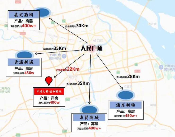 二,当下上海,同样400万级别置业选择中,菊园、罗店、安亭房、奉贤新城、惠南距离人民广场距离都在30公里以上,中建大椿•嘉利椿廷仅24公里,明显更近市区主城。