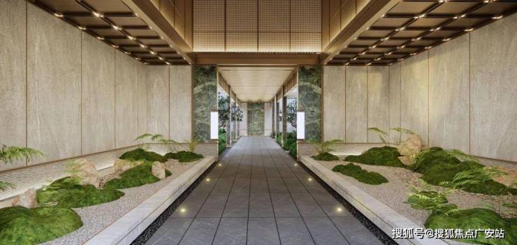 项目定制了长廊式门庭,跟城中隐奢酒店的代表“璞丽酒店”相类似,越靠近越感受到艺术的美妙,还有“枯山水”景观点缀,演绎归家气韵,从容过滤都会喧嚣与纷扰。