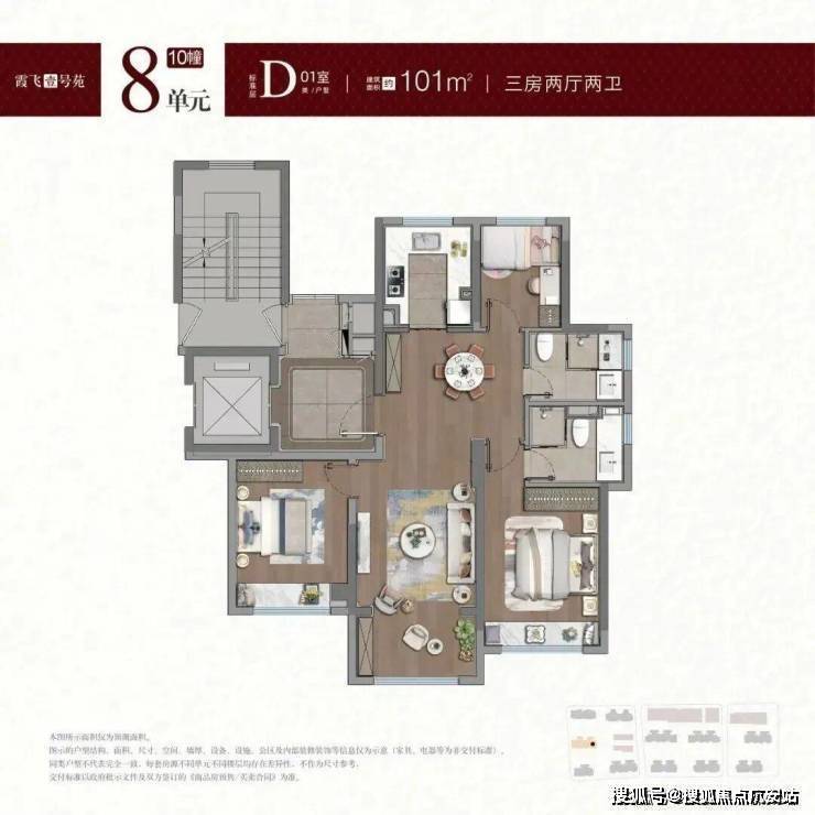 约101㎡三房户型“独立电梯厅+专属玄关”设计,拥有约6㎡私属入户空间,可定制鞋帽柜、艺术品陈列区或临时社交角。