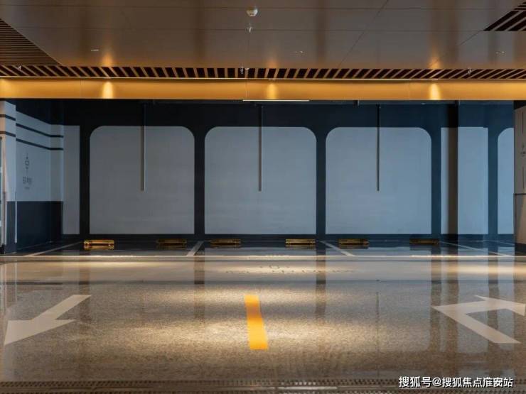 步入地库内部,视线瞬间被彻底打开。顶部采用长达约3米的蜂窝铝板与铝方通格栅铺陈,线性灯带像光流般贯穿其中,让整个空间具备了“酒店式下沉大堂”的仪式感。
