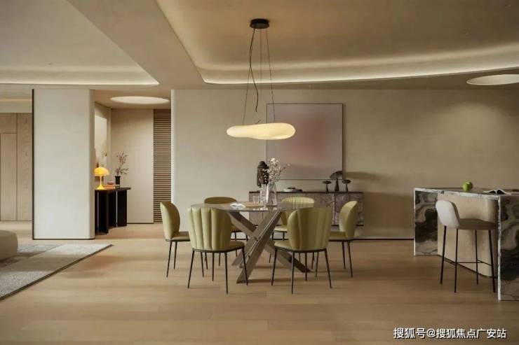 圆形餐桌的选择打破了直线的刻板感,水吧去方形的吧台,方圆的组合通过优化高度、融合材质与结构美学,将烹饪区升级,让整个环境充满温度。