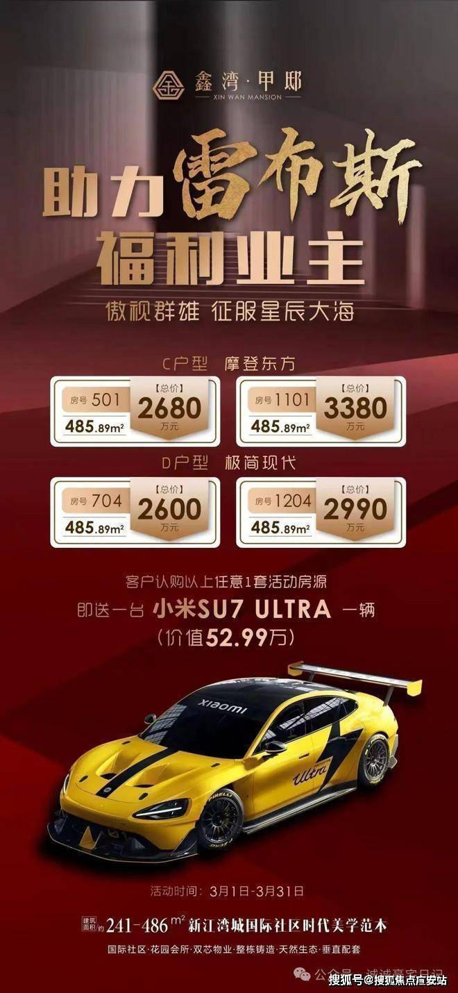 新江湾城顶奢公寓「鑫湾甲邸」年初福利,助力小米!认购特惠房源,即附赠小米SU7 ULTRA,241-486㎡大平层,预约可看!