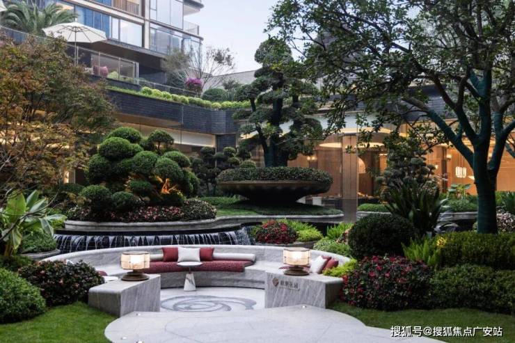 立体森境园林:师法"九溪烟树"溪谷,以多层多维立体造景手法,搭配下沉庭院、立体叠瀑,打造"空中花园"景观