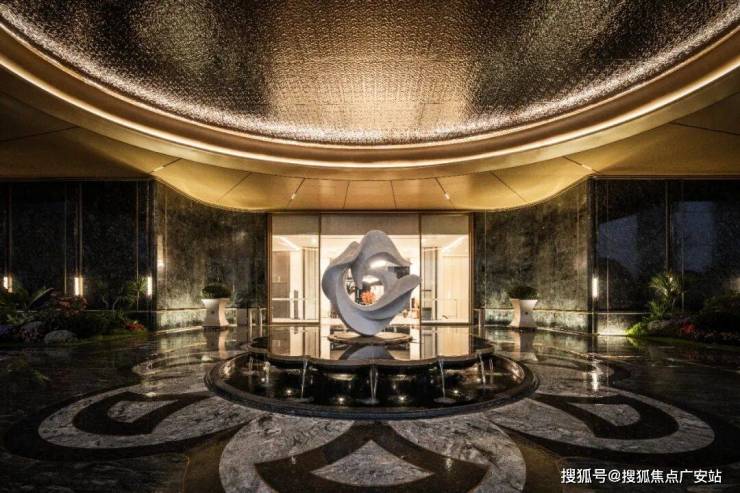 最具仪式感的应该是大门入口处:宽约35米、高约6.5米的寰宇云厅,如殿堂一般气势恢宏,两侧还有挪威蓝翡翠石材景墙对仗而立。