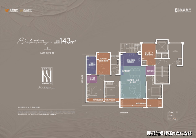 建面约143㎡的4房户型,类一梯一户的设计,每一户都有一个面积约8㎡的独立采光电梯厅空间;四开间朝南+大宽厅,采光效果爆棚;通过LDKB一体化设计,形成一个近50㎡的客餐厅空间,极大提升空间场景的可能性;卧室也采用了酒店化套房设计,主卧贯穿南北套房设计,南北皆有飘窗。