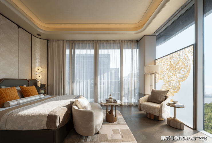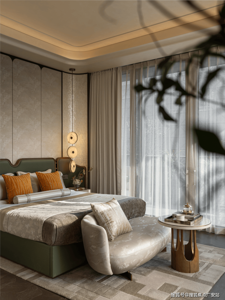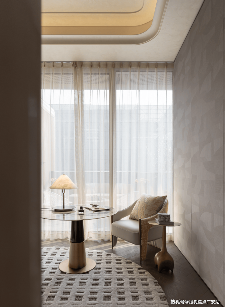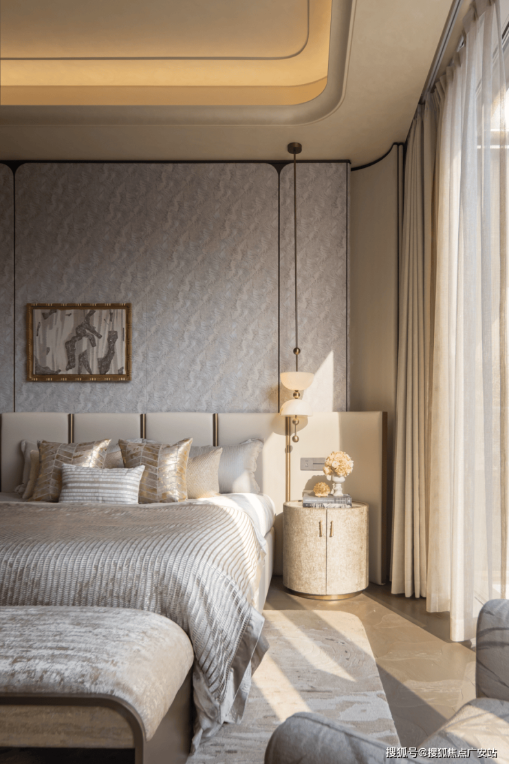 在私密且松弛的氛围,卧室无声的构建了一座心理避风港,在清晨,光线缓慢拉长,通透感浸润了房间,仿佛在轻柔的安放倦意,舒展身心。