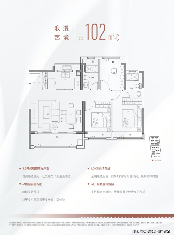 102㎡三房两厅两卫的舒适户型,约5.4m横厅设计,3.5开间朝南,得房率约80%左右(*该得房率仅供参考,最终以开发商官方数据为准);每间房均有飘窗,全屋飘窗共享有额外的面积约13㎡(*此处面积仅供参考,最终以开发商官方数据为准)在市场上也是少有的产品。