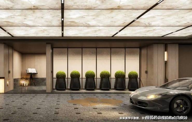 精装车库,金茂这次也拿出了流光穹顶的天幕和定制化的归家门头,甚至地面都采用了石材来增加奢华感。