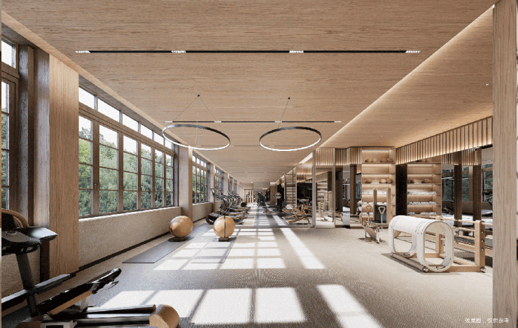 一期会所一层打造室内恒温泳池;二层打造更衣、淋浴、桑拿等空间;三层则为健身区与操房。
