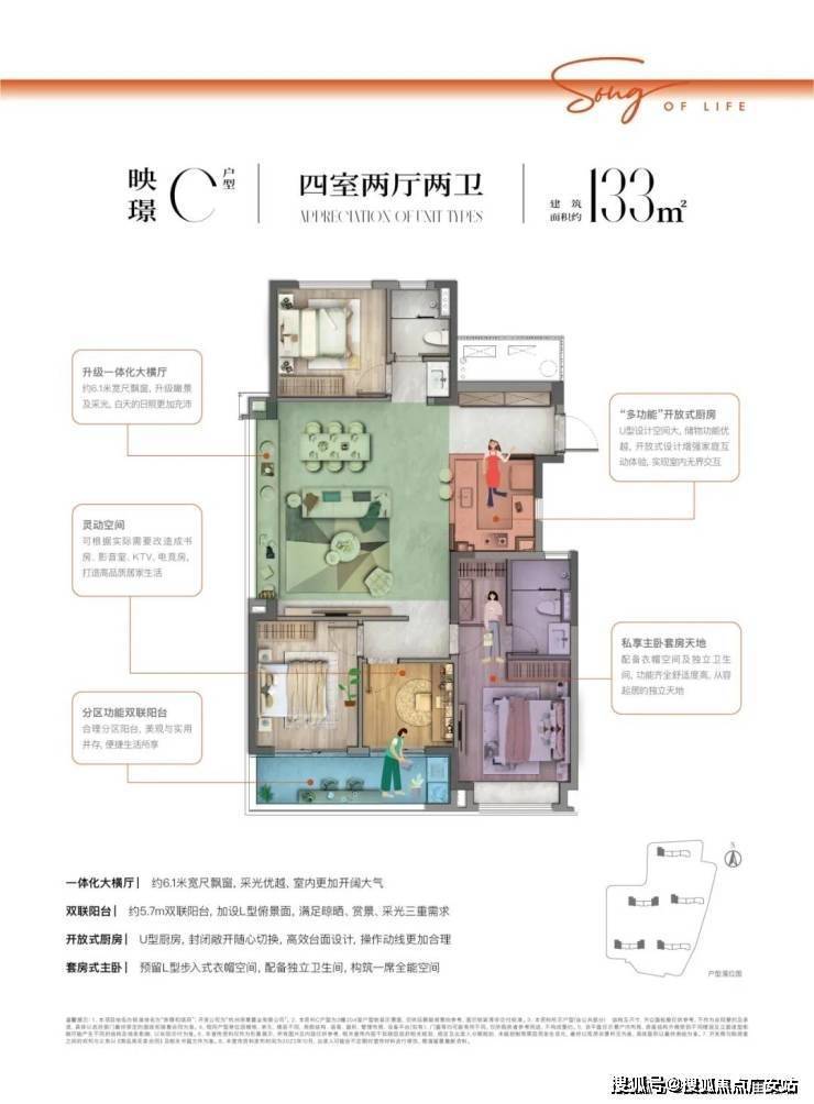 约133㎡户型点评:约6.1米宽尺飘窗,采光优越,室内更加开阔大气,约5.7米双联阳台,加设L型俯景面,满足晾晒、赏景、采光三重需求,U型厨房,封闭敞开随心切换,高效台面设计,操作动线更加合理,预留L型步入式衣帽空间,配备独立卫生间,构筑一席全能空间!
