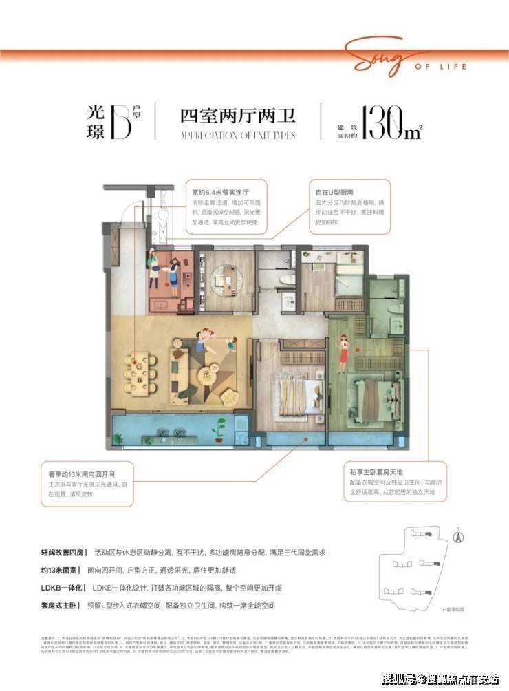 约106㎡户型点评:双联阳台约6.7米面宽,加设L型俯景面,满足晾晒、赏景、采光三重需求,LDKB一体化设计,打破各功能区域的隔离,整个空间更加开阔,开放式厨房 U型厨房,封闭敞开随心切换,高效台面设计,操作动线更加合理!
