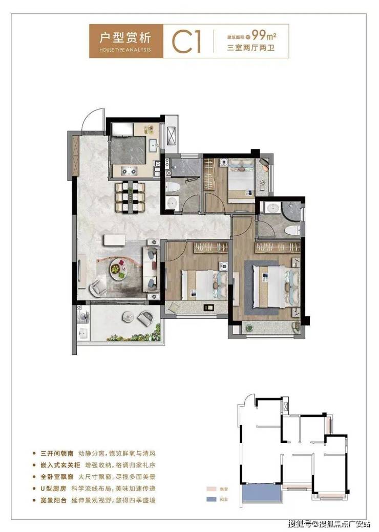 85平3房2卫,动静分离三开间朝南,厨房U型动线,主卧自带独立卫生间和飘窗,这个户型兼具低总价和功能性。
