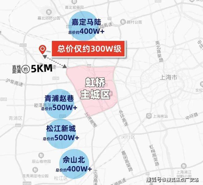通过百度地图测距我们发现:安亭距离虹桥主城区直线距离仅约5公里,但总价仅约300万级!