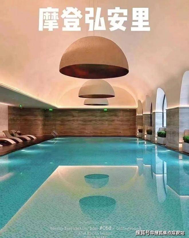 整个泳池天花板,呈现出海派拱形元素,落地玻璃窗外,是下沉式的景观空间: