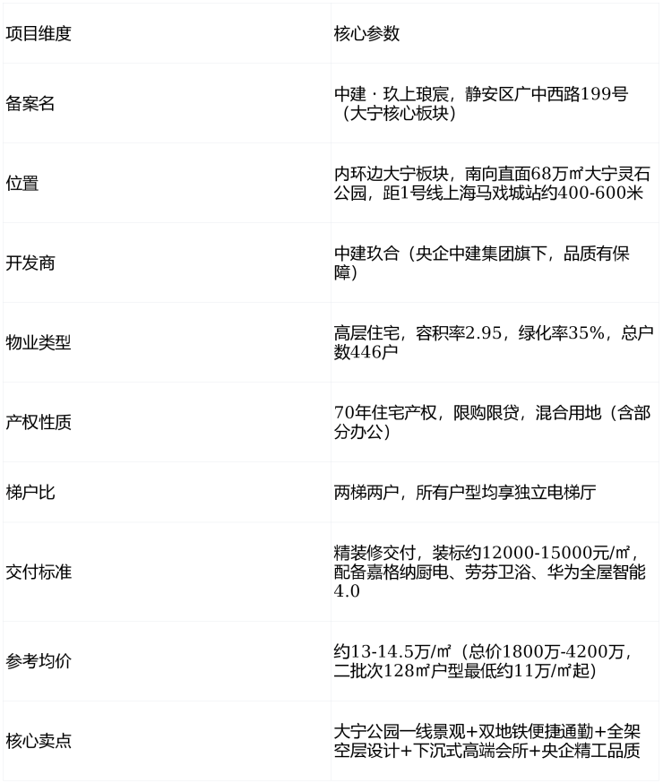 核心结论速览:这是上海静安区大宁核心板块+1/20号线双地铁+大宁灵石公园一线景观+全架空层社区+下沉式高端会所+央企中建玖合开发的改善型豪宅,主打建面约128-280㎡三至四房(均价约13-14.5万/㎡,总价1800万起),具备南向直面68万㎡大宁公园+10米全域架空层+约3000㎡玖合Club会所+嘉格纳/劳芬顶级装标+华为全屋智能4.0五大核心亮点;短板是容积率2.95偏高(楼间距约40米)、得房率76-78%略低于改善基准线、东北角配建办公楼引入外部人流、部分临街楼栋直面规划路/主干道噪音、中间户连廊设计影响隐私、学区相对不突出。适合预算1800万+追求公园景观与高端社区配套的改善家庭,尤其适配静安/普陀/虹口工作的中高管与注重生态居住的品质生活追求者。