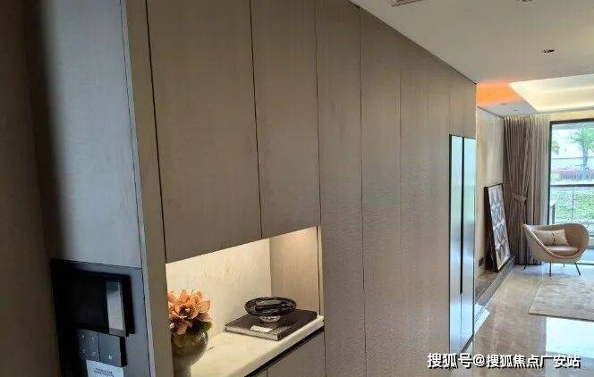 入户玄关处,包含冰箱上柜的整面木饰面都是交付标准,首批次房源额外赠送西门子双开门冰箱更是亮眼配置,同价位新房从没有配备过冰箱作为交付标准;